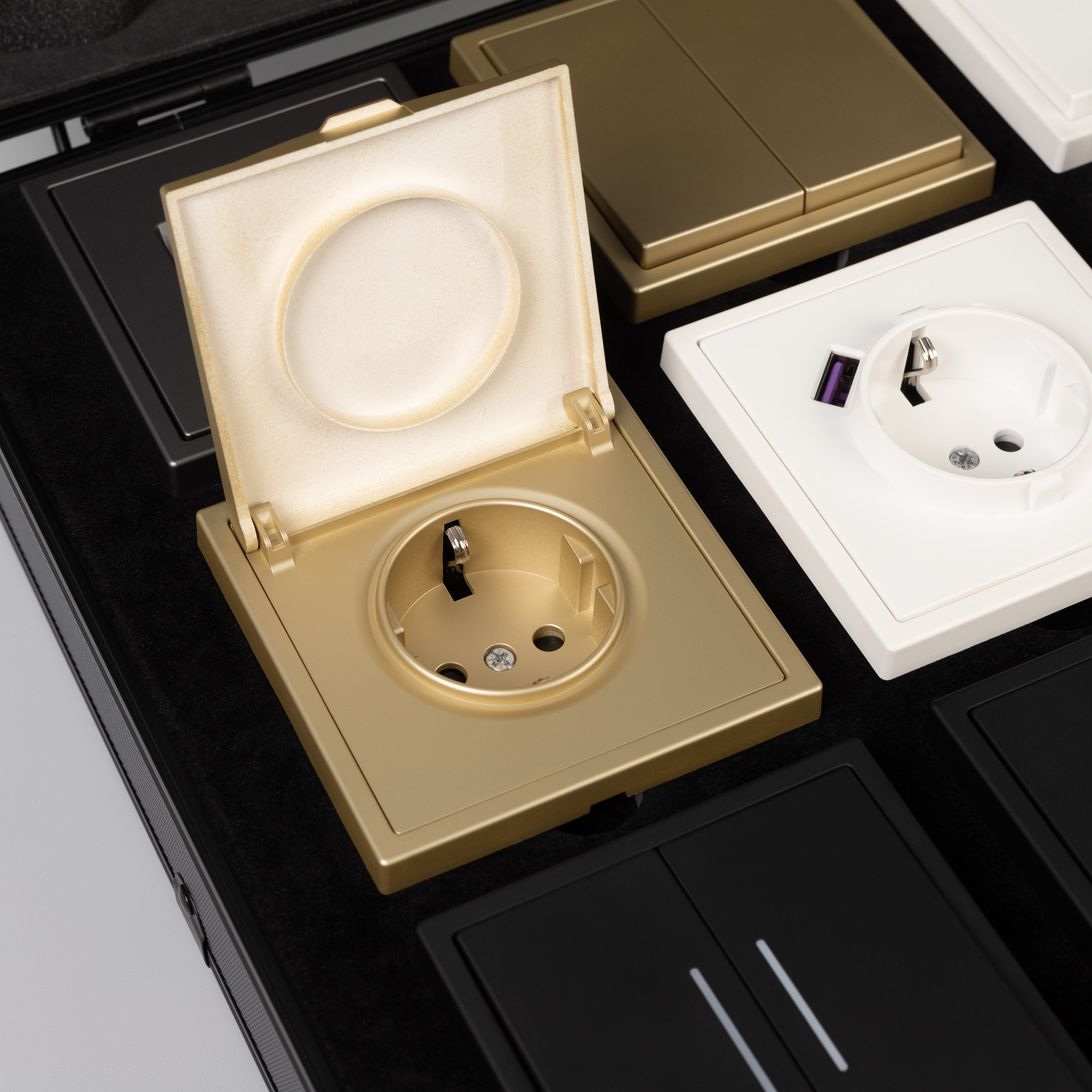 Демо-кейс с наполнением серии NOBE. Демо-кейс содержит: Рамки серии NOBE в цветах белый, черный, золотой и серебристый (серый). Поверхность рамок имеет Soft-Touch покрытие: арт.054212 - 4шт арт.054213 - 4шт арт.054214 - 4шт арт.054211 - 4шт Механизм компьютерной розетки (двойной) в серебристом (сером) цвете - арт.054315 Механизм розетки с дополнительными USB Type A + Type С выходами в белом цвете - арт.054284 Механизм выключателя на две клавиши (непроходной) в золотом цвете - арт.054253. Механизм выключателя на две клавиши с подсветкой LED (непроходной) в черном цвете - арт.054264. Механизм розетки под евровилку в черном цвете - арт.054277 Механизм розетки влагозащищенный в золотом цвете - арт.054282 Механизм выключателя на одну клавишу с подсветкой LED (непроходной) в белом цвете - арт.054232 Механизм выключателя управления шторами на две клавиши перекидные в серебристом(сером) цвете - арт.054275 Рамки представленной серии накладного типа монтажа - не требуют дополнительного оборудования для установки рамки на механизме.