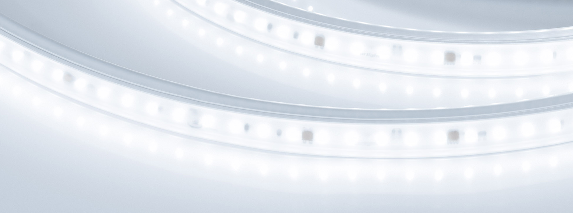 Светодиодная герметичная лента ARL серии A84 со степенью защиты IP65, защитная оболочка из ПВХ устойчива к УФ излучению. Высокий индекс цветопередачи CRI>85 обеспечивает точное восприятие цветовых оттенков. Лента подключается непосредственно к сети переменного тока 230 В и не требует использования источников питания. Наличие интегральных стабилизаторов тока позволяет подключать ленту длиной до 50 м, обеспечивая при этом равномерную яркость свечения по всей длине ленты. При подключении нескольких лент необходимо подавать питание на каждые 50 м отдельным кабелем, последовательное подключение лент более 50 м запрещается. Лента применяется для декоративной подсветки помещений, потолочных ниш, создания контуров рекламных объектов внутри помещений. Ленты обладают низким коэффициентом пульсаций FlickerFree <2%. Для расчета потребляемой мощности необходимо учитывать коэффициент мощности - PF>0.75. На лентах установлены микросхемы с функцией снижения тока для защиты ленты от перегрева, обеспечивающие надежную работу в различных условиях. Диммирование в диапазоне 30%-90% осуществляется TRIAC диммерами с установкой минимального уровня яркости, при диммировании коэффициент пульсаций увеличивается. Крепление с помощью скоб, аксессуары для монтажа и подключения поставляются отдельно. Поставка под заказ от 100 м.