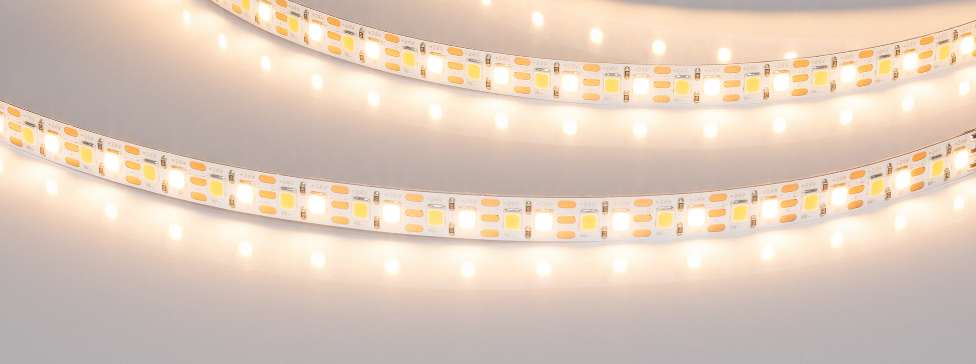 Светодиодная лента UL серии A168, шириной 8 мм, мощностью 18 Вт/м, с изменяемым цветом свечения (MIX) в диапазоне от белого (6000K) до теплого (2700K). Напряжение питания 24 В. Светодиоды SMD 2835, 168 шт/м. Высокий индекс цветопередачи CRI>90, обеспечивающий точное восприятие цветов при освещении любых жилых и коммерческих помещений. Минимальный отрезок 11.9 мм (2 светодиода). Двухканальная лента с тремя проводами для подключения, управляется MIX-контроллером. Применяется для создания биодинамического освещения, декоративной подсветки элементов интерьера, мебели. Обязательна установка на профиль.