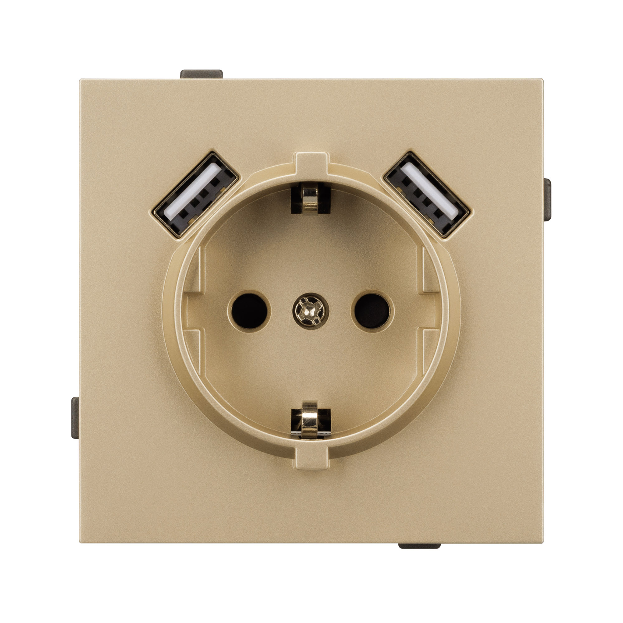 Механизм розетки с заземлением на 1 пост и 2USB Type A порта. Цвет - золотой, с Soft-Touch покрытием. Без фронтальной рамки. Уровень пылевлагозащиты IP20. Розетка устанавливается в стандартный подрозетник круглого сечения диаметром 60мм.