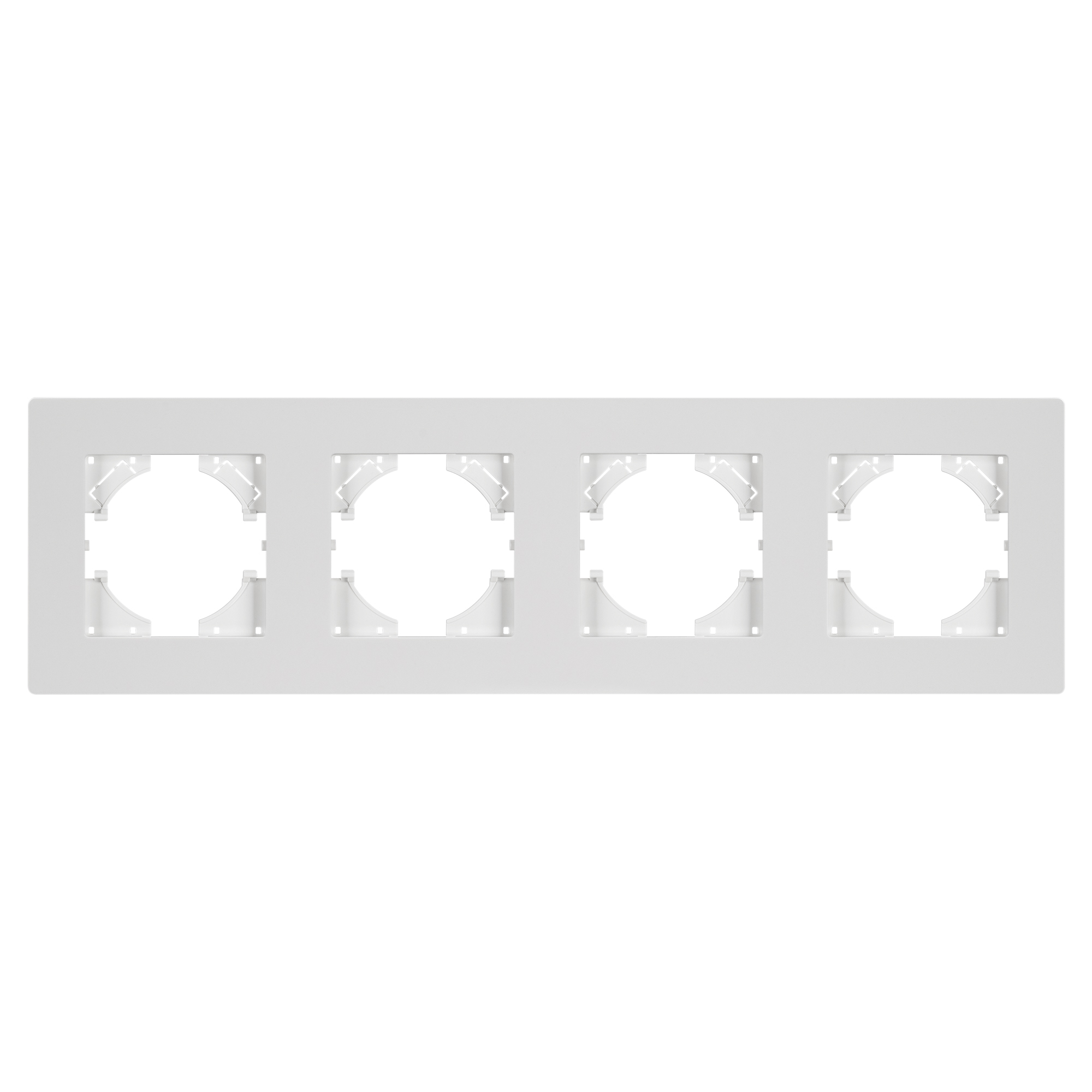 Рамка пластиковая на 4 поста, под встраиваемый механизм. Цвет - белый. Среднего уровня герметичности IP20. Ориентация монтажа - горизонтальная (основным ориентиром служат посадочные выступы для накладки механизма).
